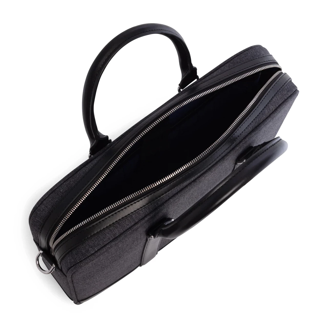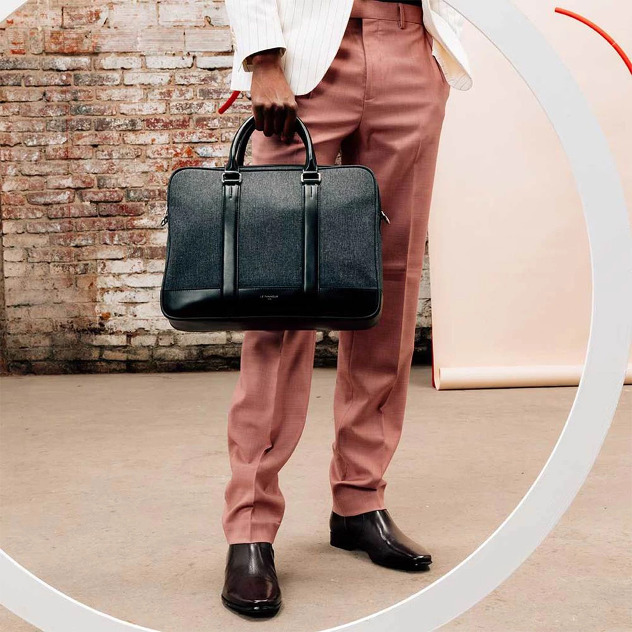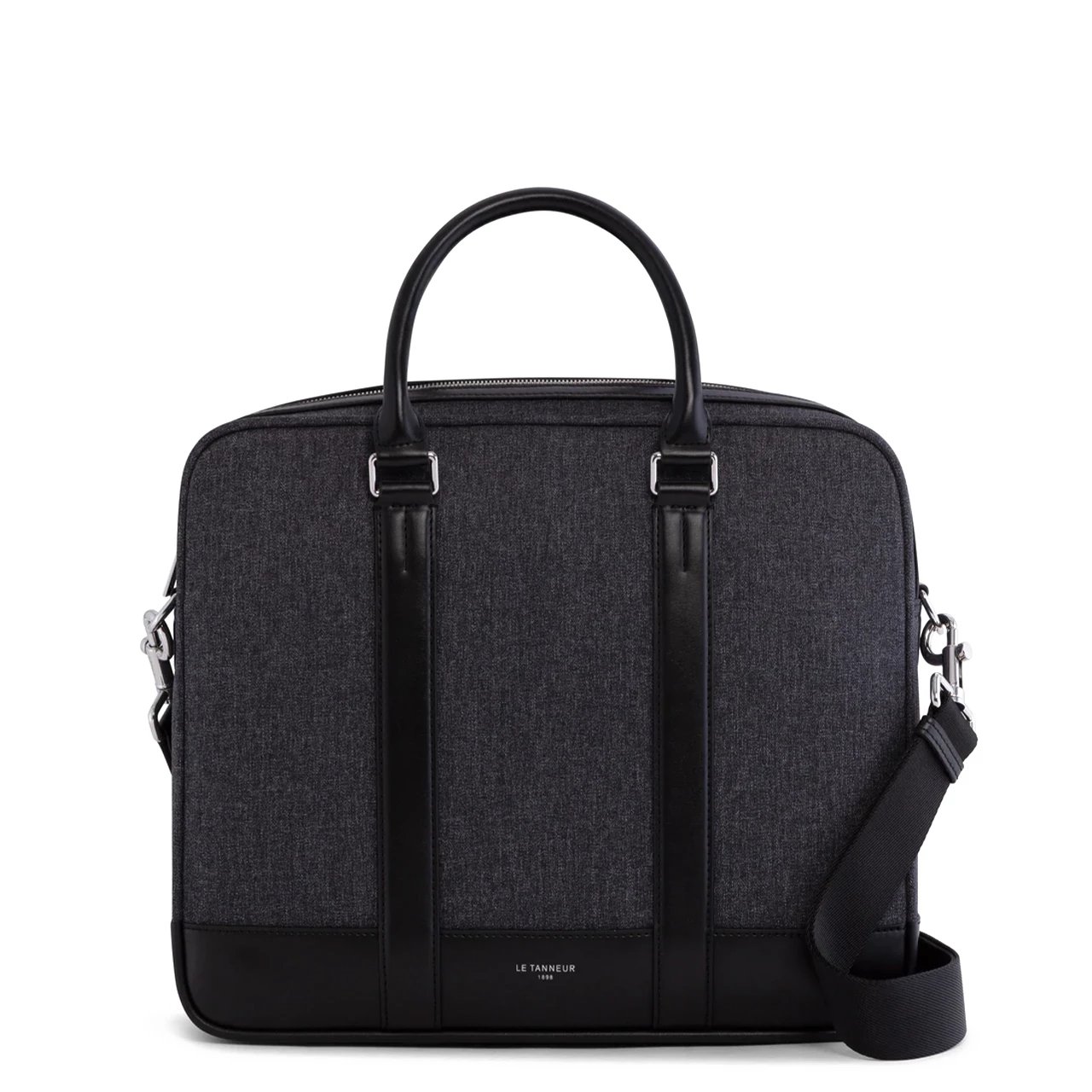 Die grau melierte Aktentasche aus Canvas des Hauses Le Tanneur überzeugt mit elegantem Design und praktischer Handhabe. Um verschleißanfällige Stellen besser zu schützen, wurden sie mit Spaltleder verstärkt, die im Innenleben verarbeiteten Polsterungen lassen den Laptop gut einbetten. Die Aktentasche besteht aus einem Faltfach, einer Trolleyschlaufe sowie abnehm- und verstellbaren Riemen, damit die Tasche in der Hand, über der Schulter oder umgehängt getragen werden kann. Das Branding “Le Tanneur” auf Silberfolie sowie silberfarbene Metallteile sind stilvolle Designelemente, die die Aktentasche zum unauffälligen Hingucker machen.
