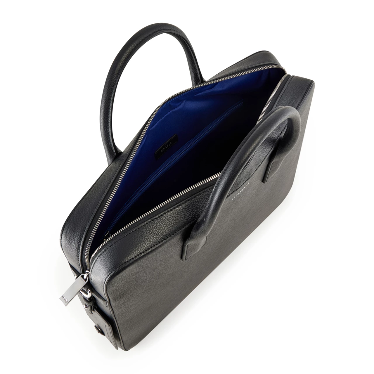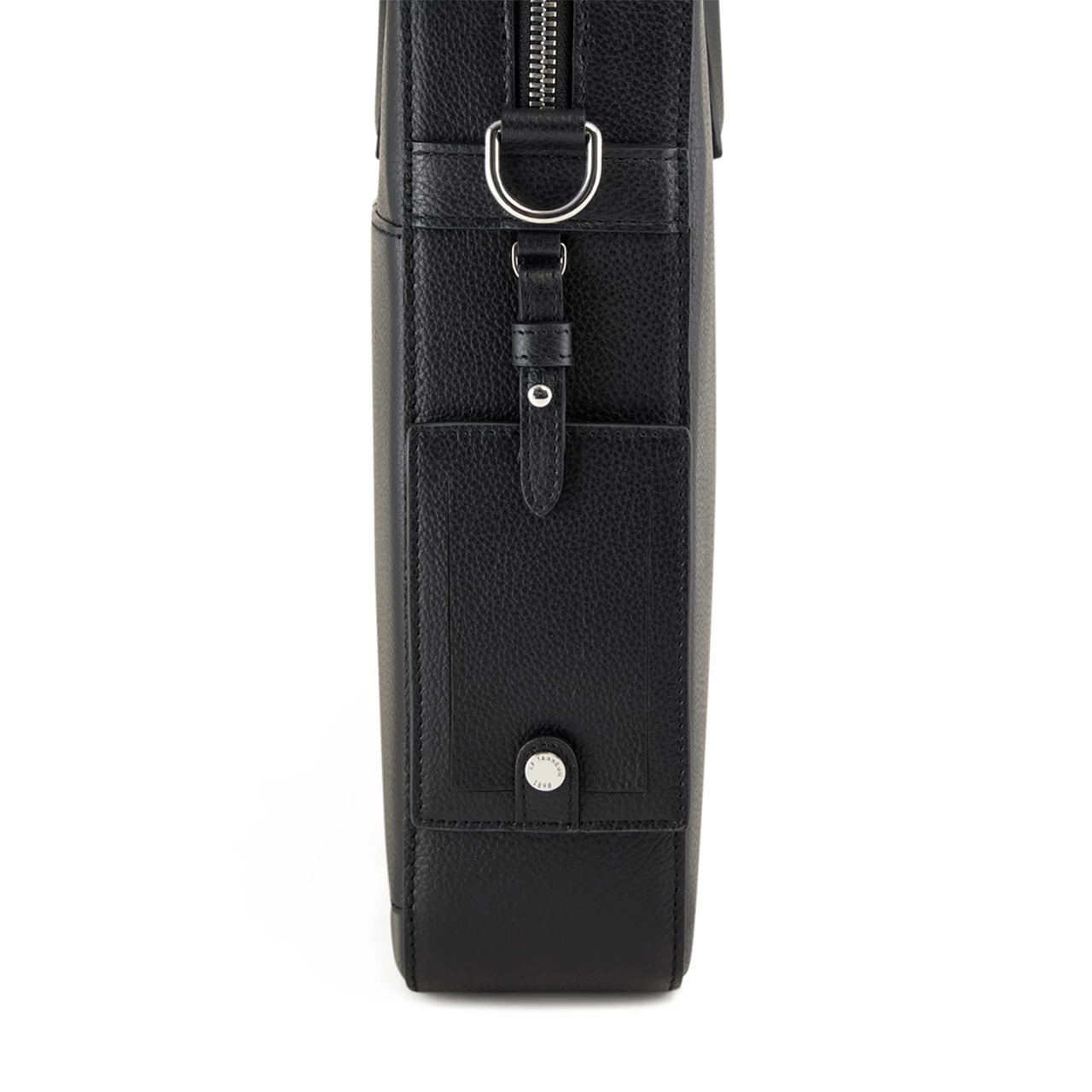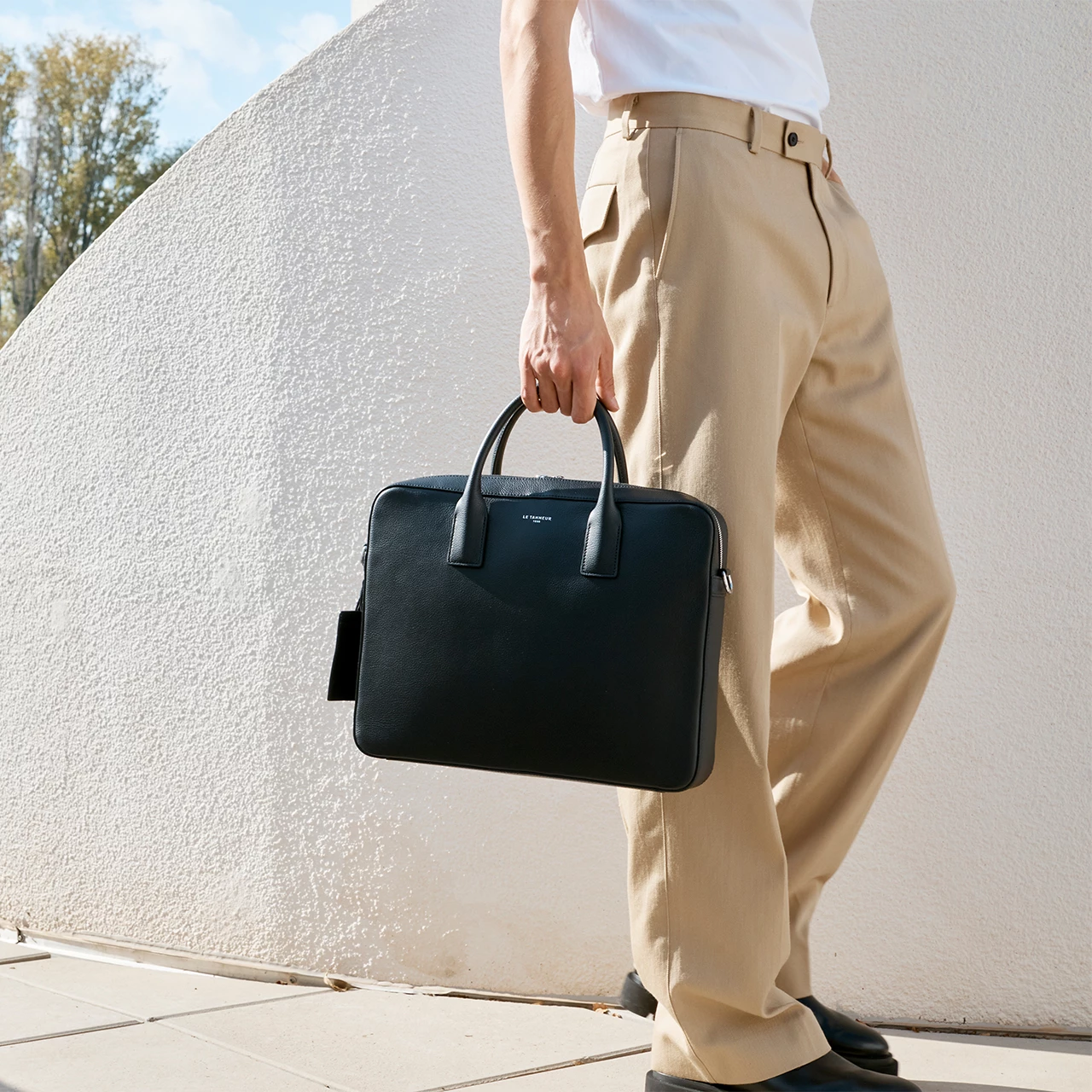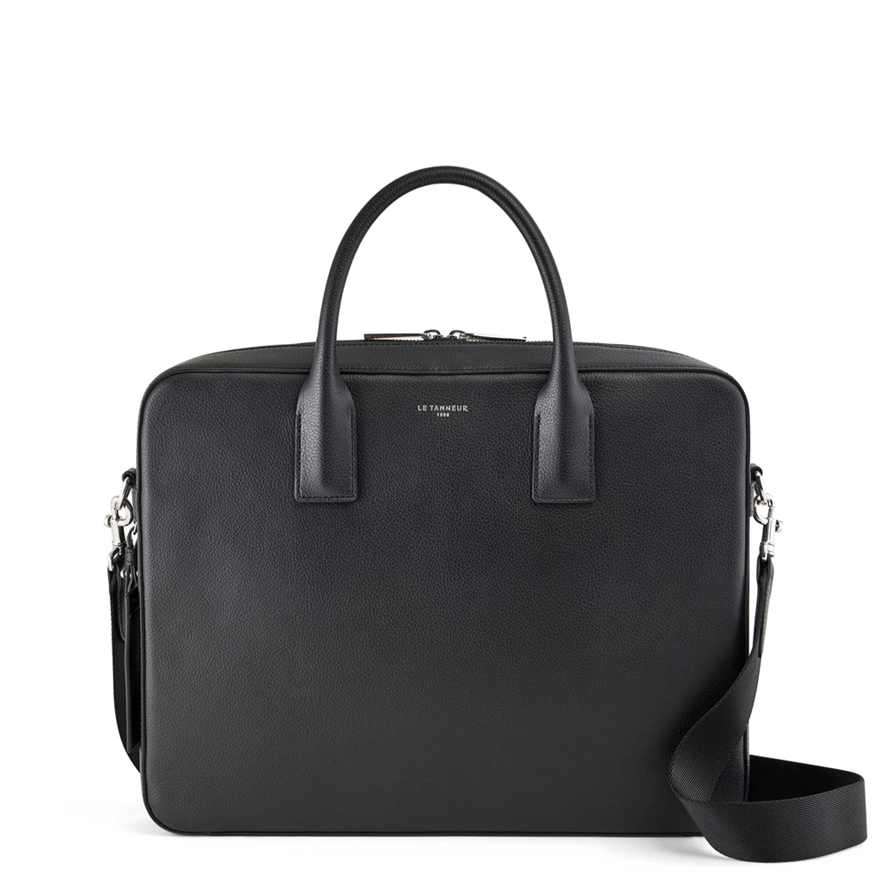 Die schwarze Aktentasche aus hochwertigem Leder des Hauses Le Tanneur aus der Kollektion Emilie überzeugt mit elegantem Design und exklusiven Materialien. Im Innern finden sich drei flache Fächer sowie ein Reißverschlussfach. Das Fach mit den verarbeiteten Polsterungen dient dazu, den Laptop sicher und komfortabel einzubetten. An der Front- und Rückseite bietet die Tasche jeweils ein Fach mit Druckknopf, in denen beispielsweise Dokumente verstaut werden können. Neben den Handgriffen kann die Tasche, dank einer Trolleyschlaufe, auch über der Schulter oder umgehängt getragen werden. Das Branding “Le Tanneur” auf Silberfolie sowie silberfarbene Metallteile sind stilvolle Designelemente, die die Aktentasche zum unauffälligen Hingucker machen.