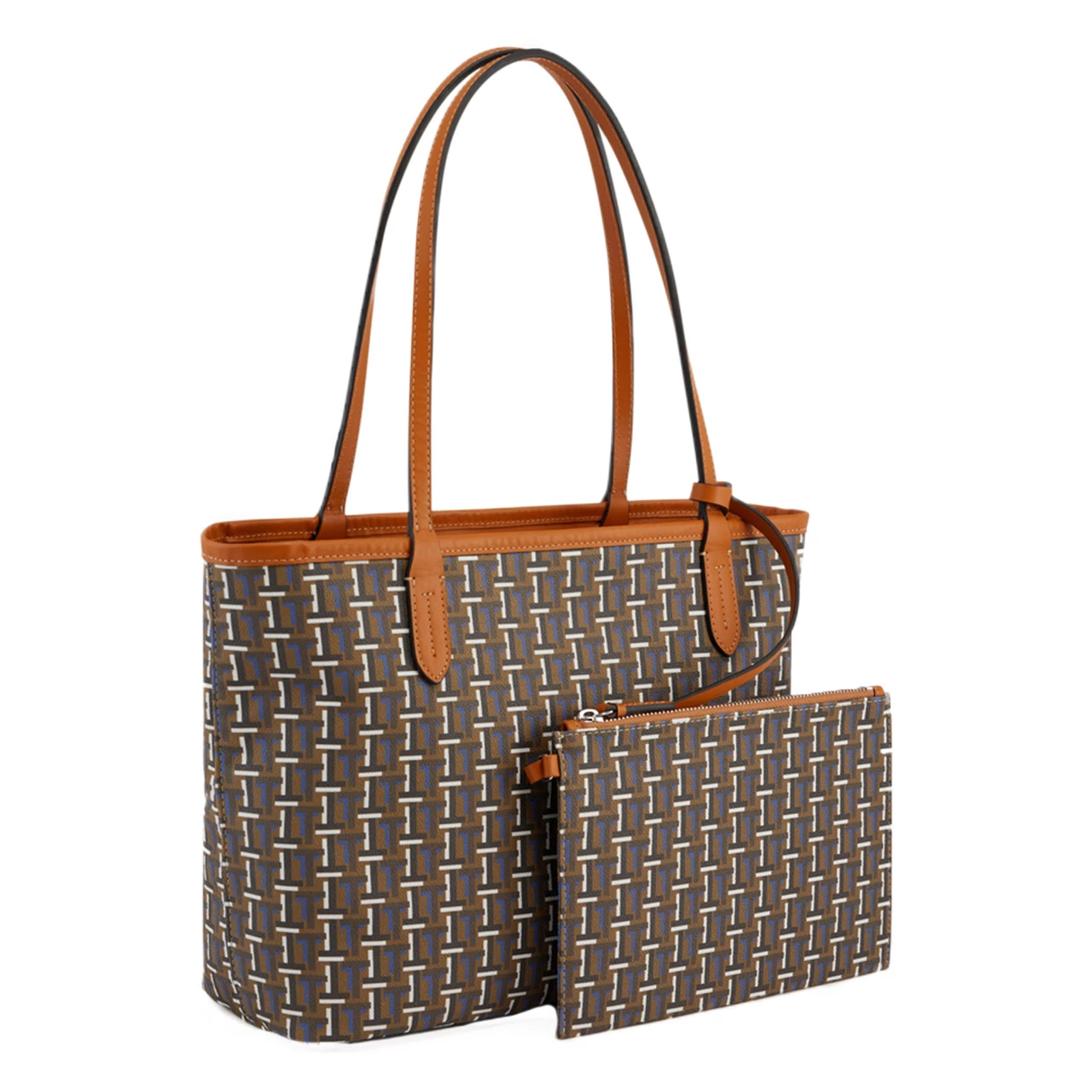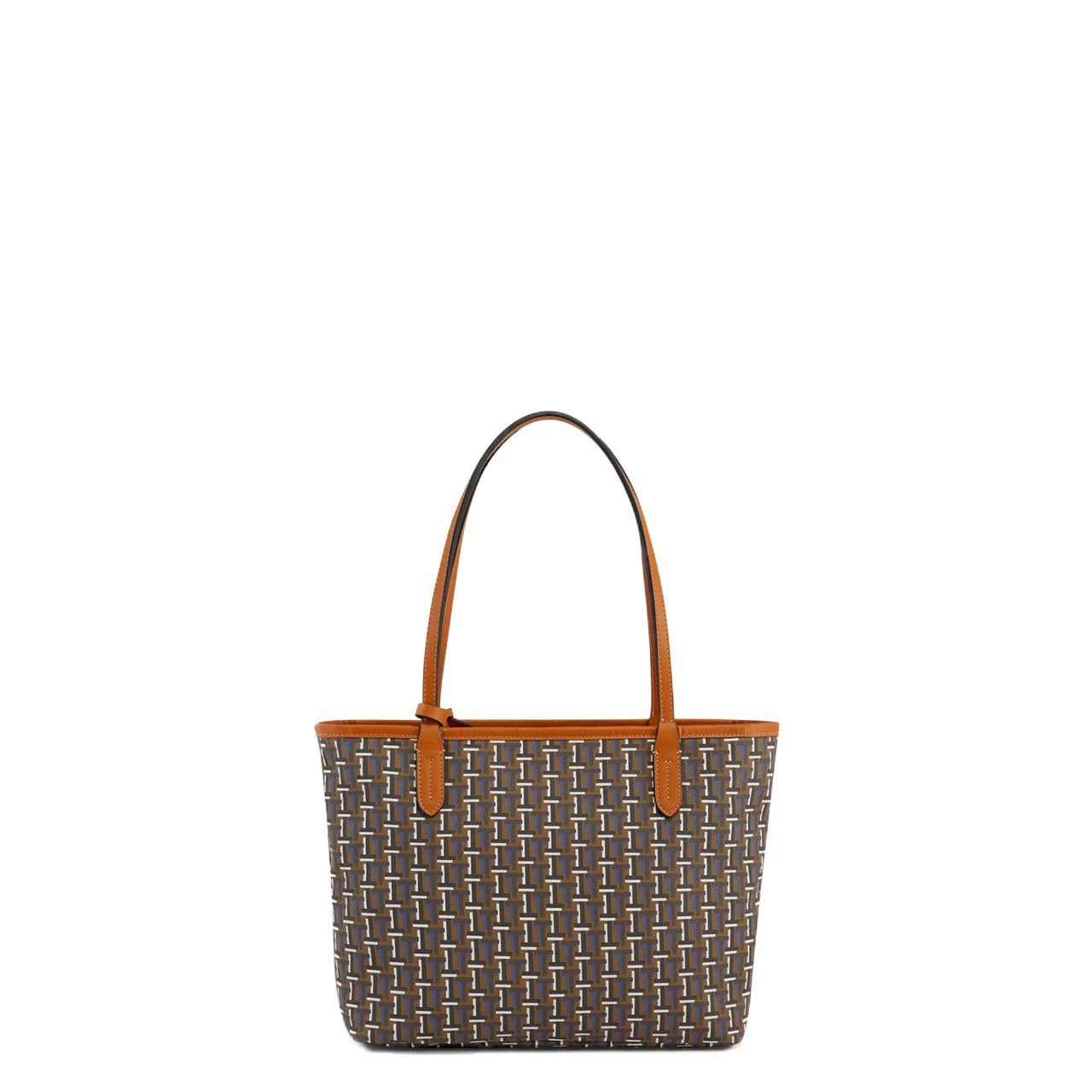 Der kleine Shopper des Hauses Le Tanneur aus der Kollektion Camille überzeugt mit elegantem Design und exklusiven Materialien. Im Innern findet sich ein herausnehmbare, mit Reißverschluss versehene kleine Innentasche in dem für die Marke kennzeichnenden, blauen Textilfutter. Von außen zeigt sich die Tasche in einem blau-schwarz-weißen Signature-Branding auf braunem, beschichtetem Canvas mit cognacfarbenen, pflanzlich gegerbten Lederelementen und einem handlichen Trageriemen.