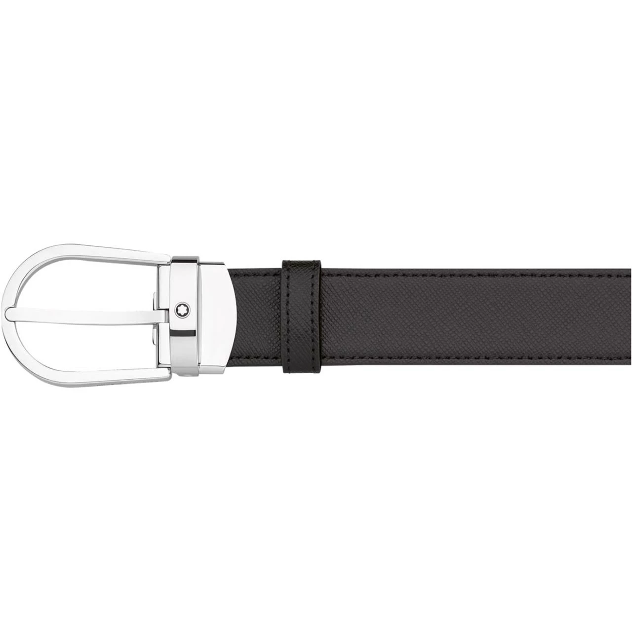 Glänzende, hufeisenförmige Dornschließe aus Edelstahl mit Montblanc Emblem. Verstellbarer Wendegürtel aus schwarzem & braunem Leder mit Saffianlederprägung, 3 cm x 120 cm.