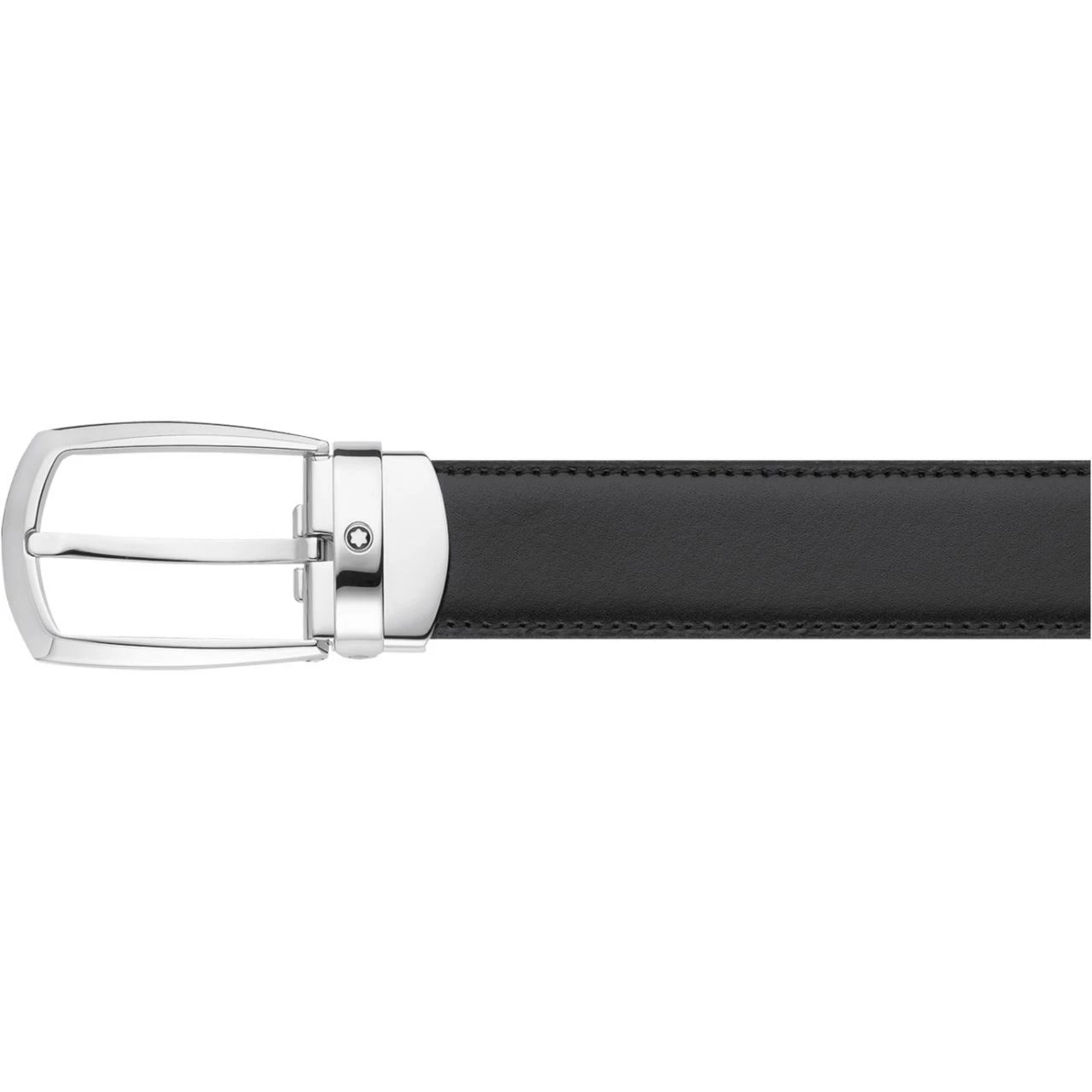 Glänzende, palladierte, hufeisenförmige, rechteckige Dornschließe mit Montblanc Emblem. Verstellbarer Wendegürtel aus schwarzem & braunem Leder, 3 cm x 120 cm.