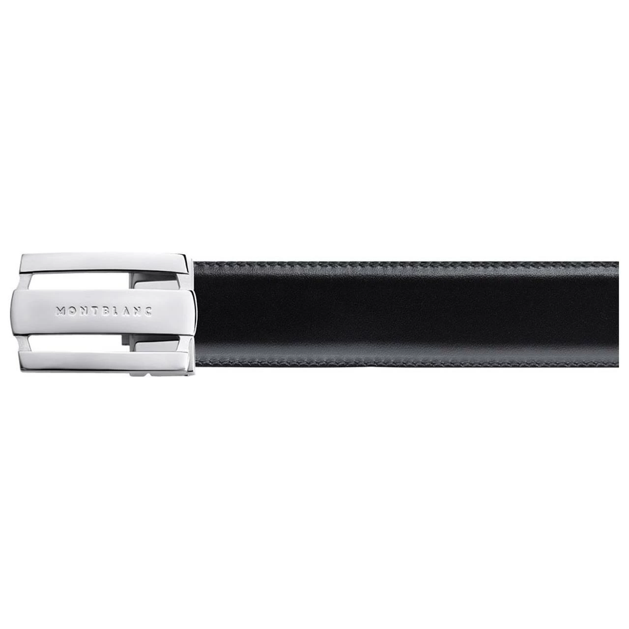 Wendegürtel aus schwarzem/braunem Leder. Glänzende, palladierte Riegelschließe mit ausgestanztem 3-Ringe Motiv.